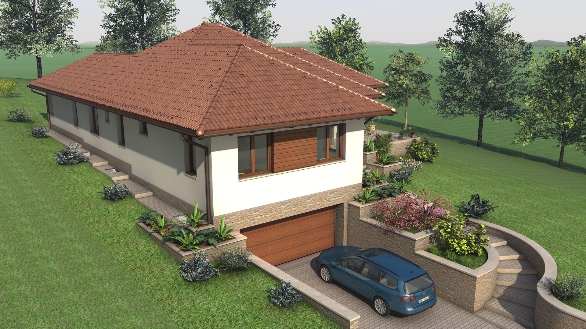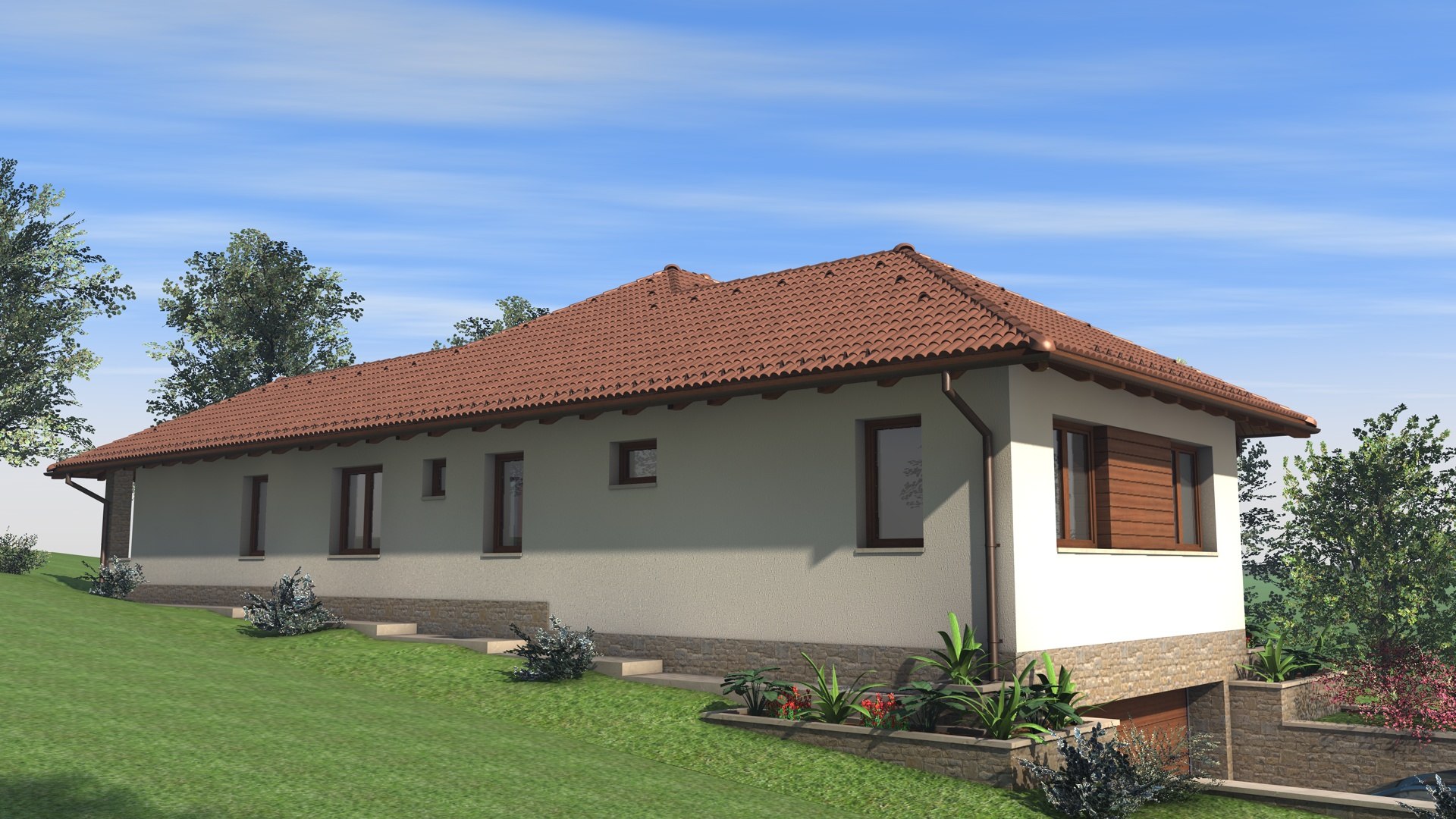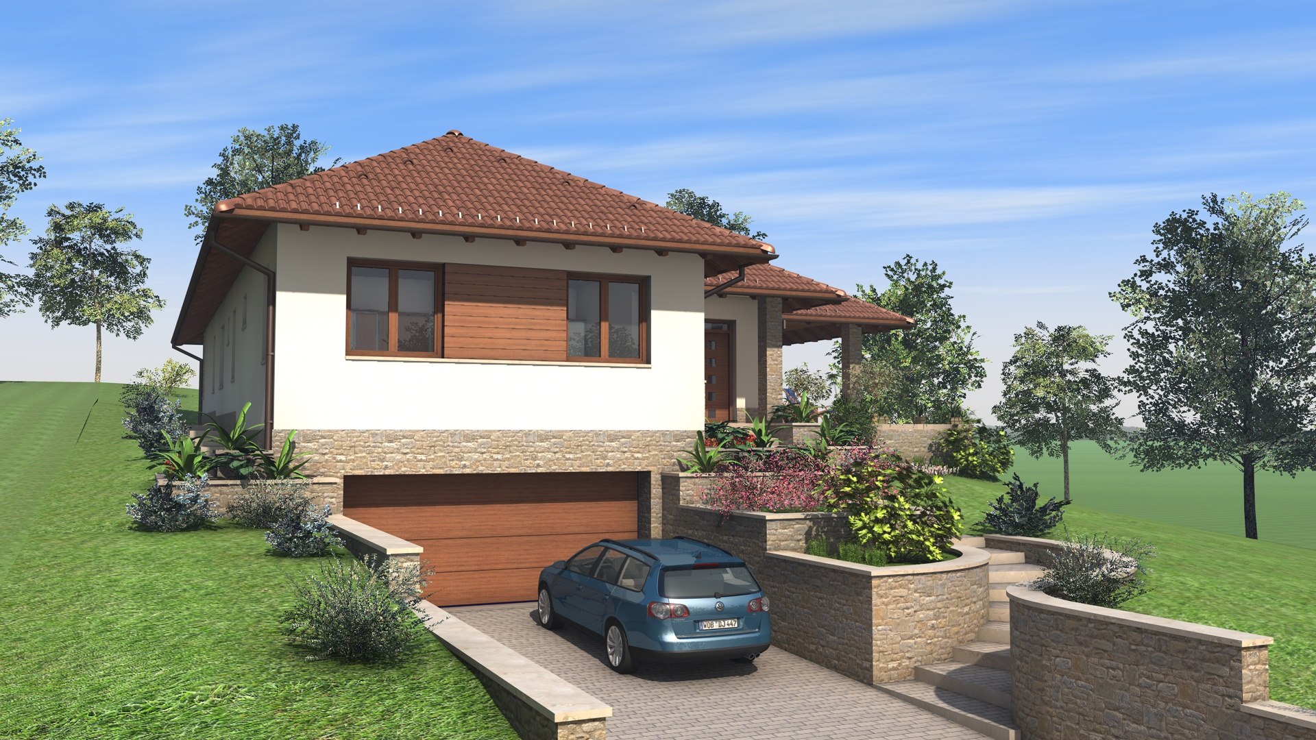 Kétszintes családi ház, lejtős telken.