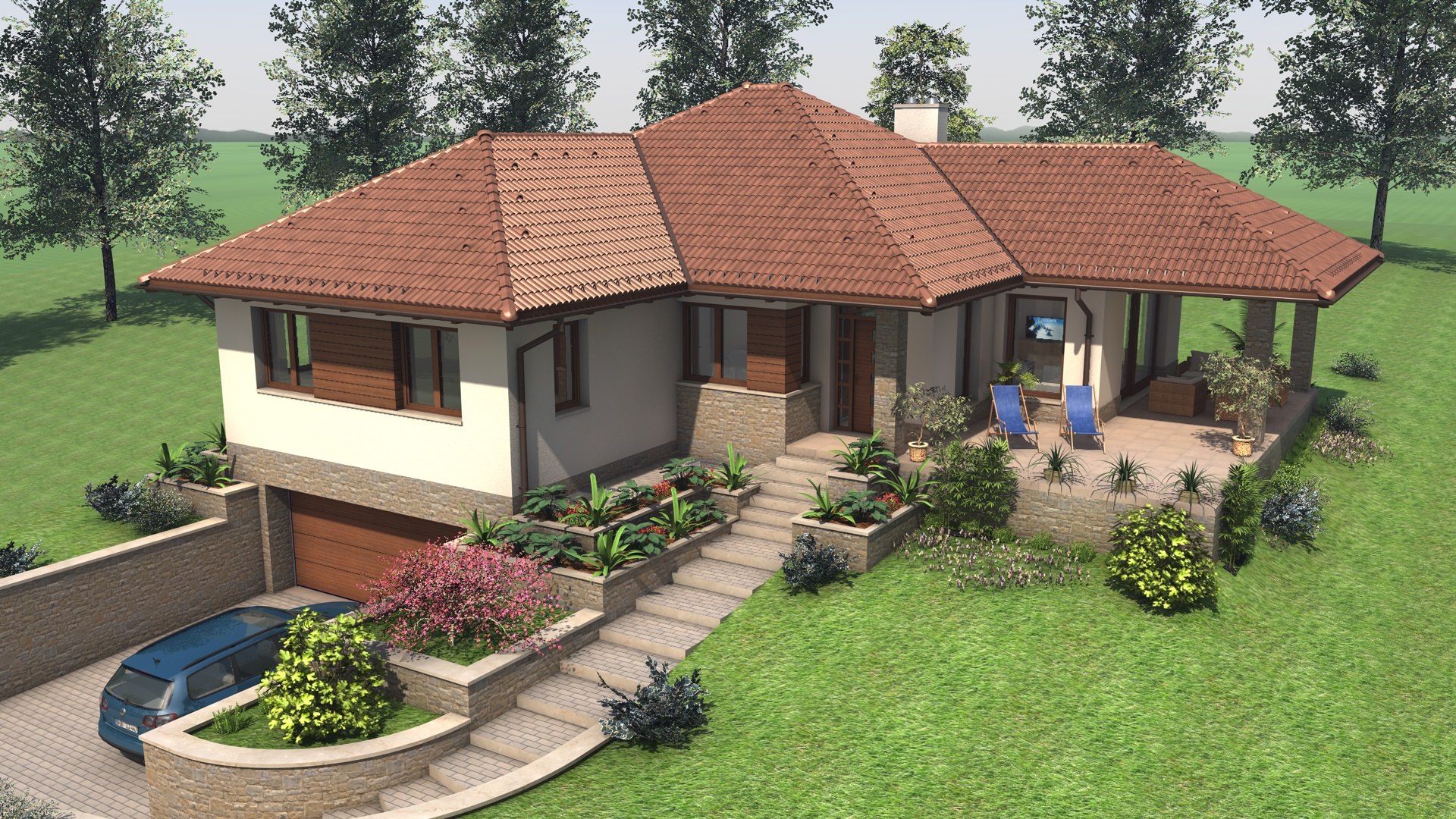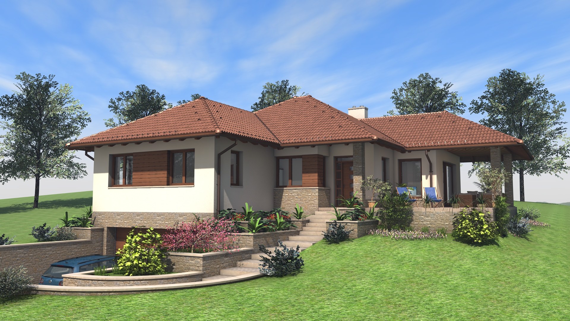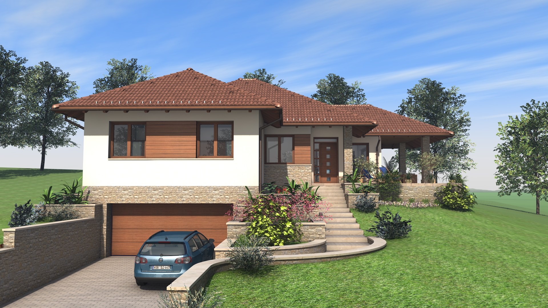 Kétszintes családi ház, lejtős telken.