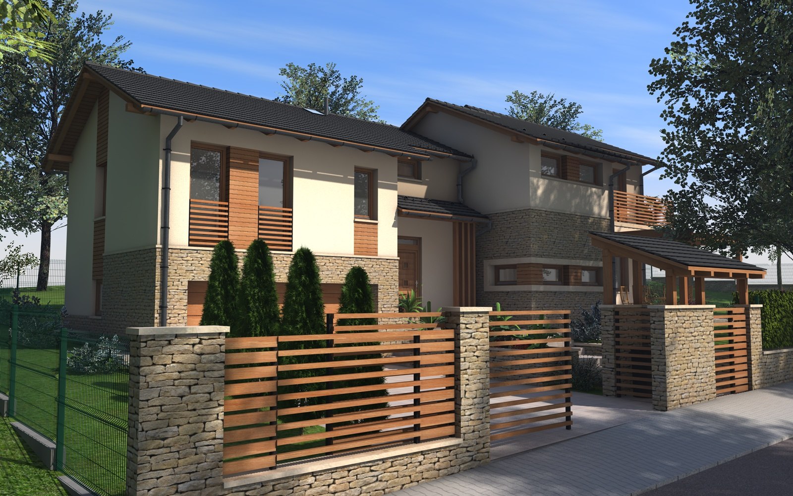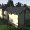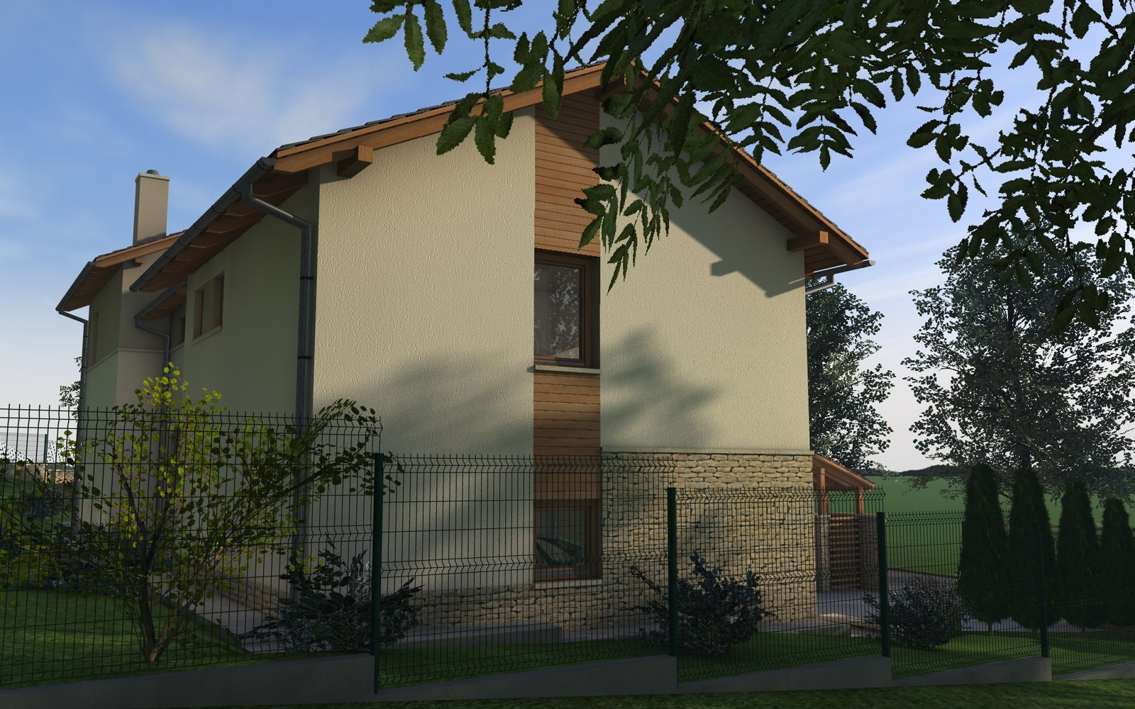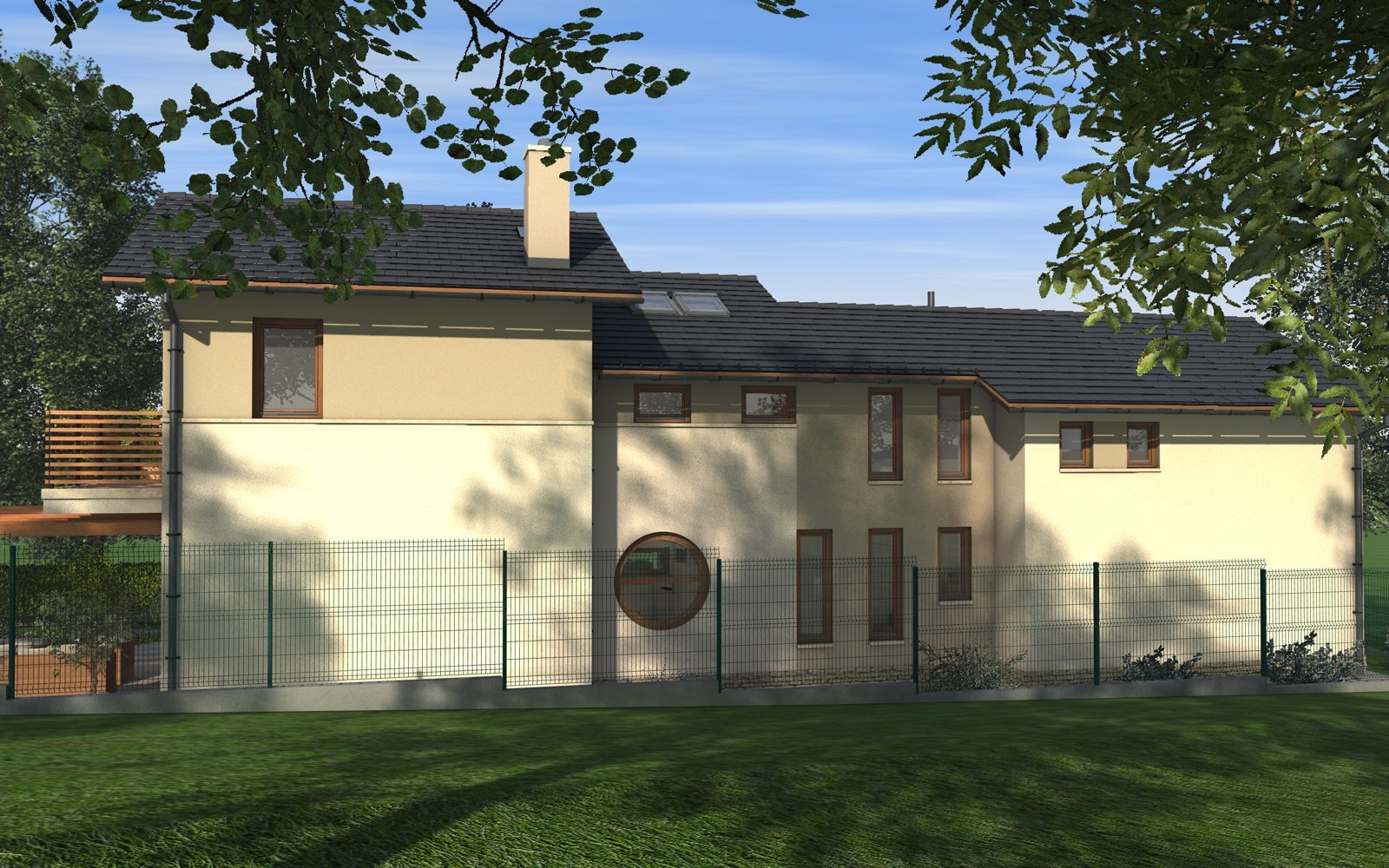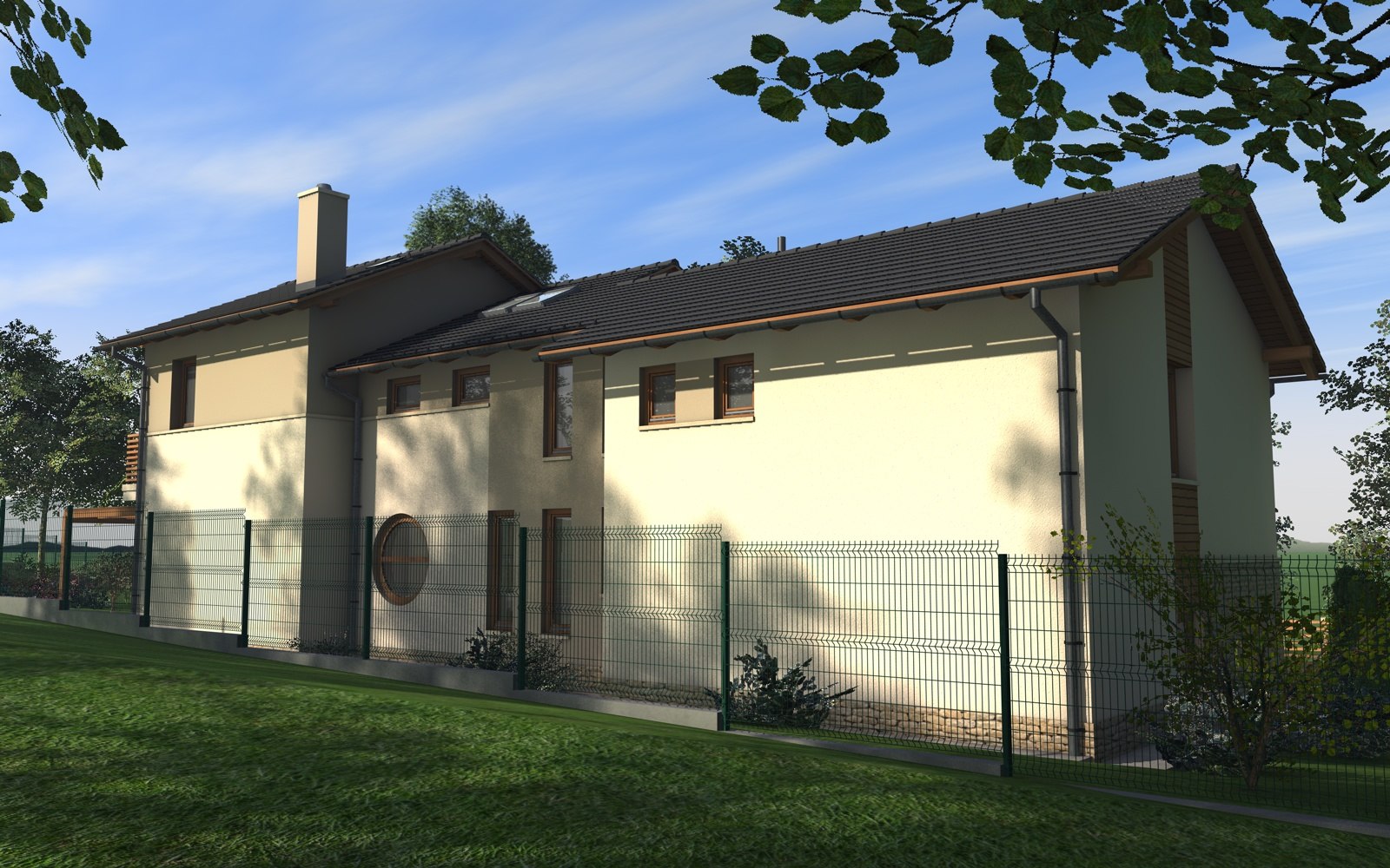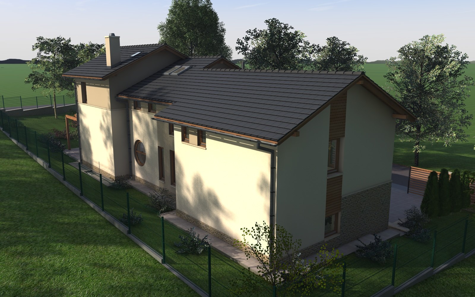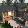 A tervezett épület egyszerű tömegű, nyeregtetővel fedett ház, részben alápincézve. A telek lejtését kihasználva az épületet szinteltolással alakítottuk ki. A garázst az utca szintjén, a földszinti lakóteret fél szinttel feljebb, az udvar szintjén helyeztük el.