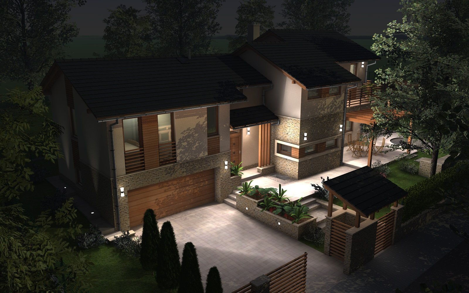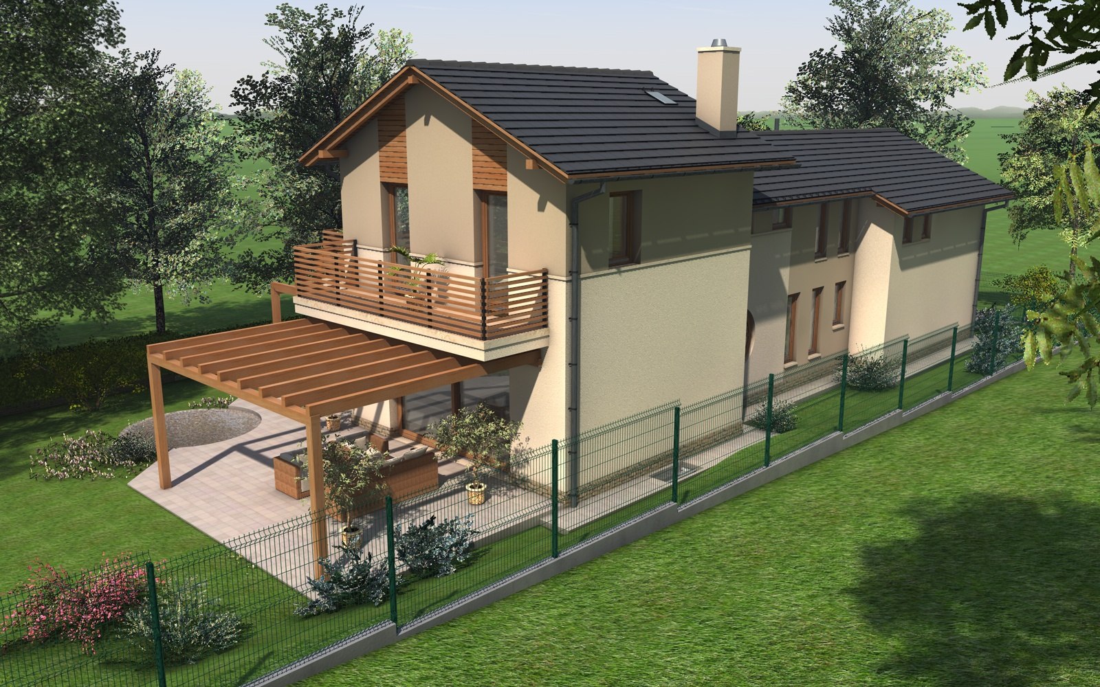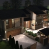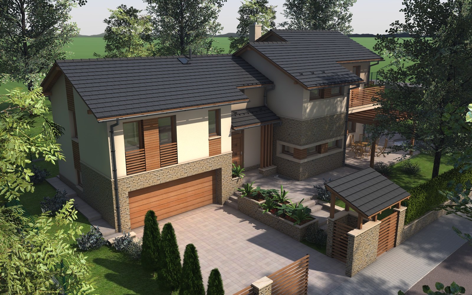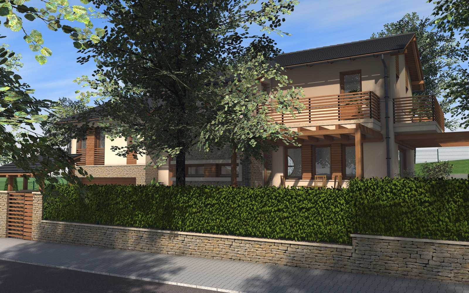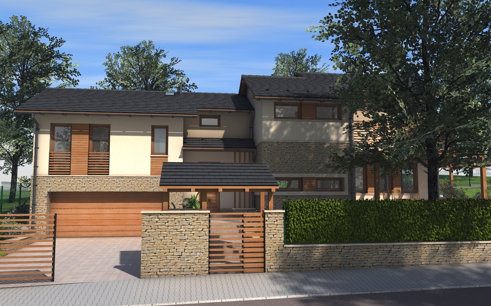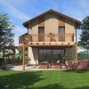 A tervezett épület egyszerű tömegű, nyeregtetővel fedett ház, részben alápincézve. A telek lejtését kihasználva az épületet szinteltolással alakítottuk ki. A garázst az utca szintjén, a földszinti lakóteret fél szinttel feljebb, az udvar szintjén helyeztük el.