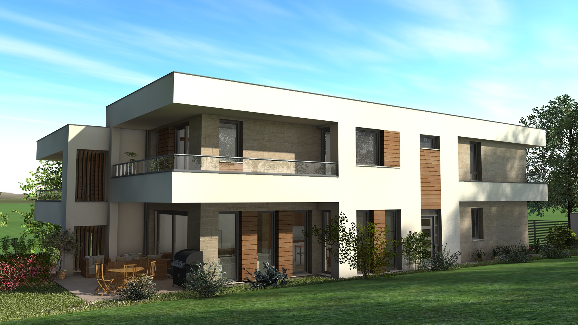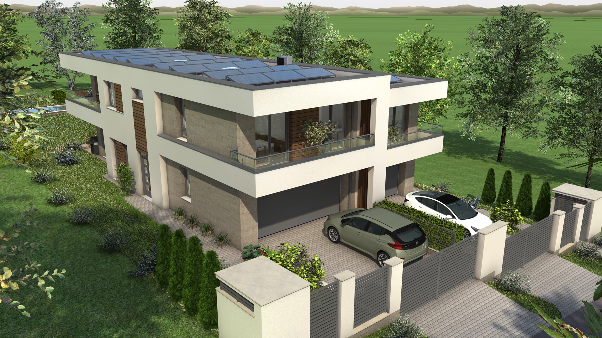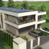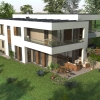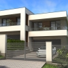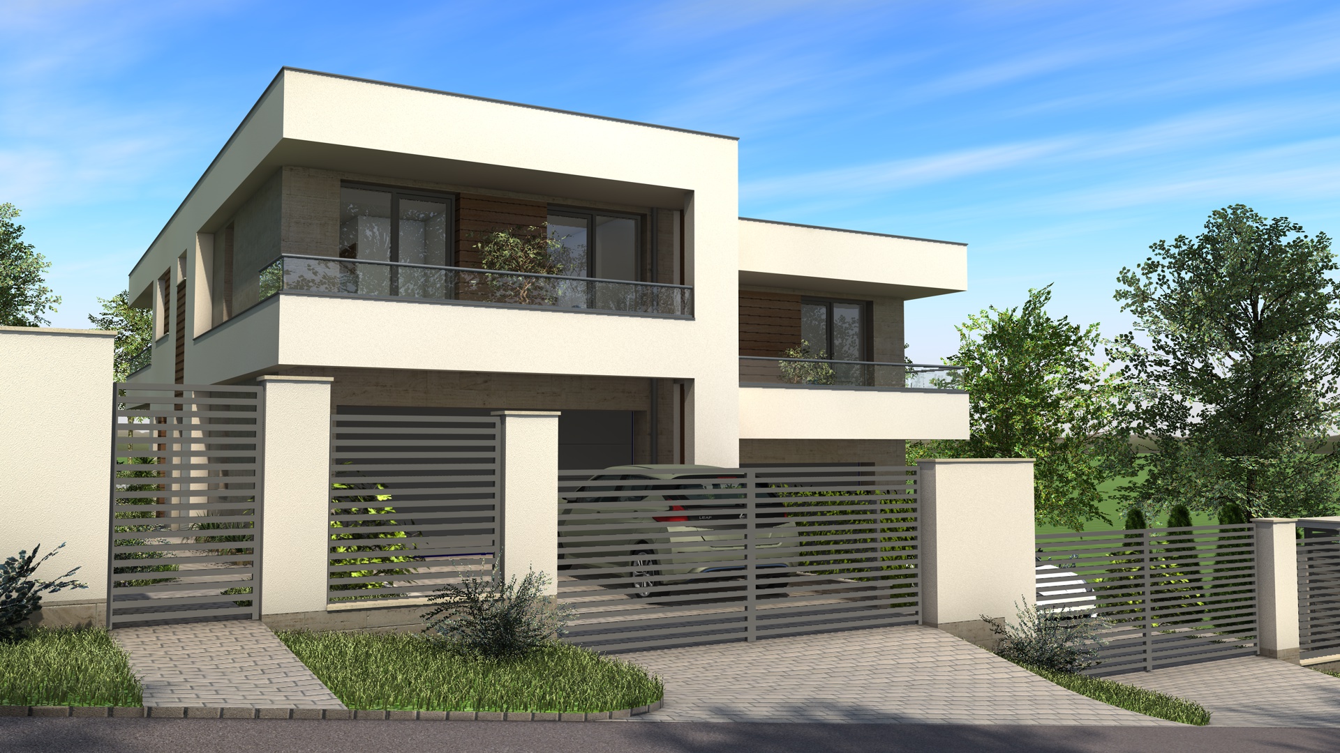 Kétlakásos lakóépület lejtős telken. A kétállásos garázsok a földszinten kaptak helyet. Alapterület lakásonként: Földszint: 89 m2 (ebből garázs 33 m2) Emelet: 89 m2