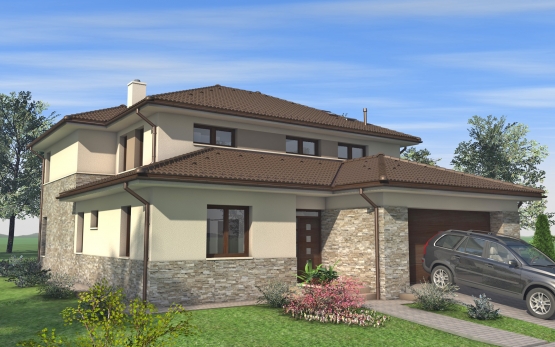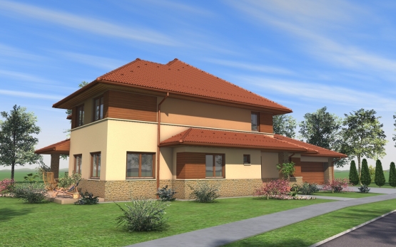 Kétszintes családi ház, lejtős telken.